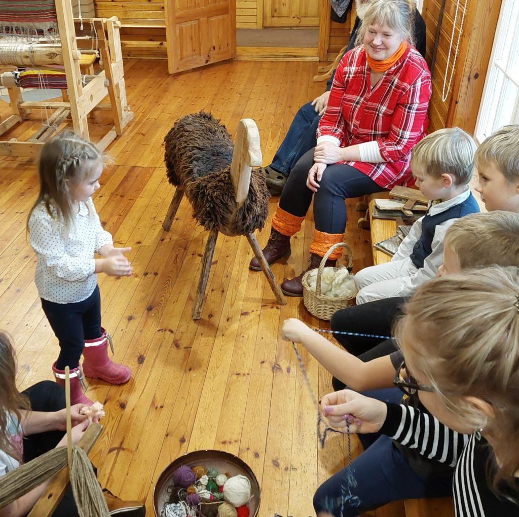 Kui voki tallamine on selge ja lõng ka mängult valmis, hakkame kerilaualt lõnga kerasse kerima. Heidame pilgu ka meie muuseumi villaste esemete kogule ja proovime ketti heegeldada. Keti saab laps koju kaasa.